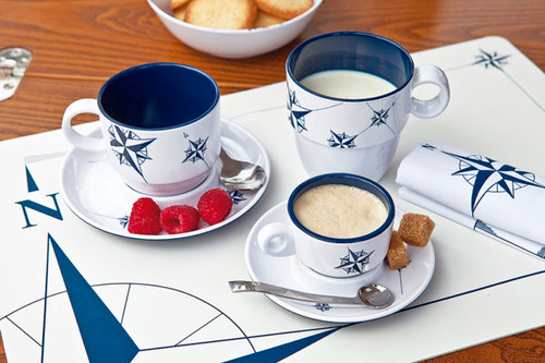 The NORTHWIND mug is perfect for breakfast and tea. The mug is made of unbreakable melamine in white with a navy blue compass rose feature. Other nautical accessories that accompany this item are the sugar bowl and milk jug set and the moka teaspoons in stainless steel. The thermos, the coffee set and the bowls are other essential items that complete the Northwind collection.