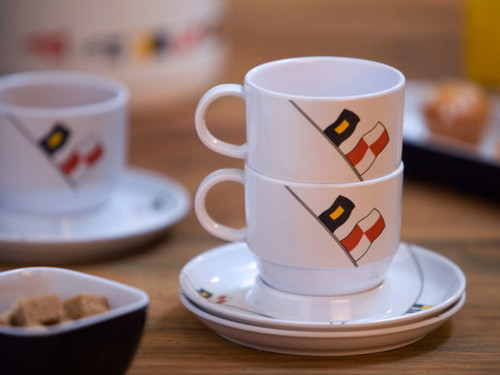 The REGATA breakfast set, in white melamine and with a nautical flag design, has an edging on the saucer to stop the cup moving if the boat rocks. The non-slip feature of this nautical accessory will enable you to enjoy your breakfasts and desserts on board without worrying. Have a look at the section Only for boats for other items and products for boats exclusive to Marine Business