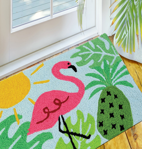 This machine washable Jellybean® accent rug features a bright design that will shine brightly in indoor and outdoor spaces alike. From poolside to the office, the golden sun, lush green foilage, pineapple and hot pink flamingo on a clear sky are welcome reminders of summer.
